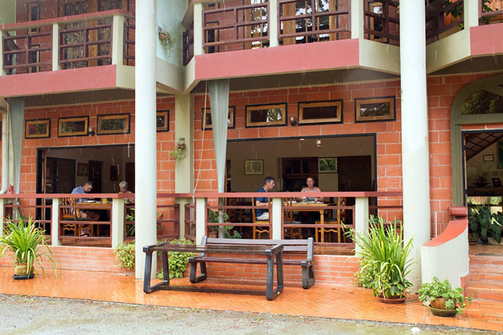 The dining area overlooks the forest and hummingbird feeders that afford guests close-up bird watching along with pleasurable dining. Guests are able to enjoy a spectacular and entertaining view of the many species of Hummingbirds that visit the property. Such pleasure is not confined to daytime dining since the White-tailed Nightjar is also a regular evening visitor, catching flying insects at the lights outside the dining area.